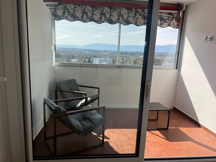 Chambre avec douche dans une salle de bain privative fermée accessible à la chambre. Et un balcon avec une superbe vue sur le jet d’eau de Geneve et le Salève.