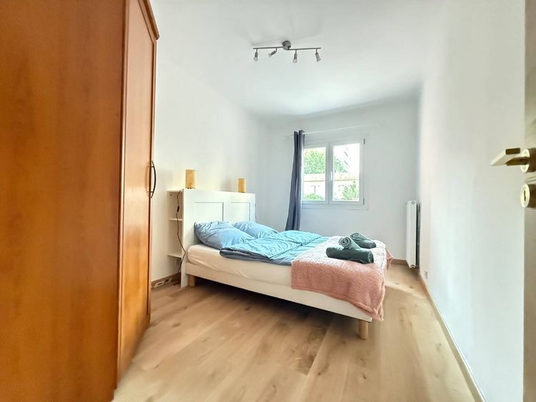 Chambre spacieuse et lumineuse de 12 mètres carrés avec un lit double et une armoire.