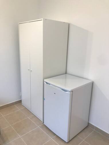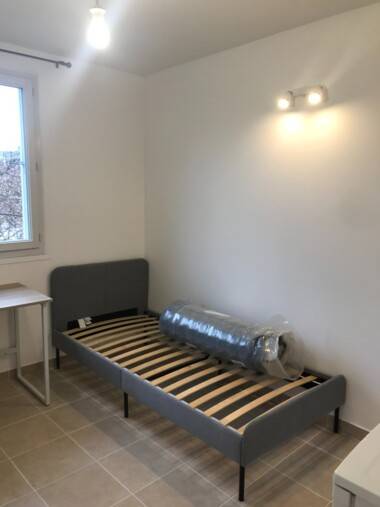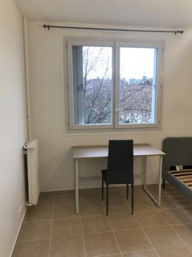 Chambre 2 de 17 m2 disposant un balcon de 5m2, avec un lit 140 x200, une armoire, un bureau, une étagère, une chaise et un frigo (possibilité pour un couple ou 2 amis)