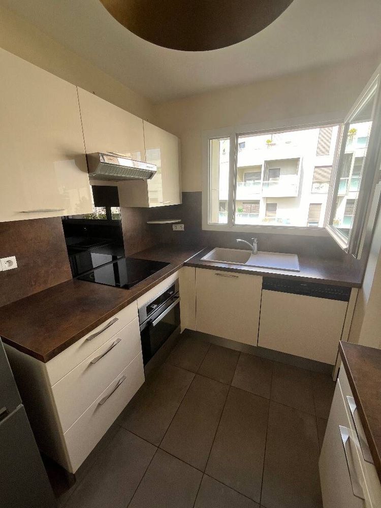 En face de vous, la cuisine fermée toute équipée (plaques à induction, four, lave vaisselle, nouveau frigo américain d'1m80 avec vrai congélateur, hotte et beaucoup de rangements. Il comprend déjà une batterie de casseroles Tefal neuves, assiettes, couverts etc.