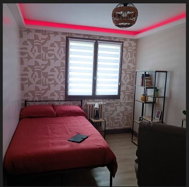 Chambre cosy au charme moderne, alliant confort et style industriel. Elle est aménagée avec soin pour vous offrir un espace à la fois pratique et chaleureux : un lit double accueillant, une table de chevet avec lampe, un bureau spacieux de 110 cm accompagné de son fauteuil, ainsi qu’un grand placard avec porte miroir offrant à la fois un espace penderie et des étagères pratiques. Pour plus de confort au quotidien, vous trouverez également un panier à linge, une corbeille à papier, un éclairage plafonnier complété par un bandeau lumineux pour créer différentes ambiances. Le linge de lit et de toilette est fourni, avec deux types de couettes (été et hiver) pour un séjour agréable toute l’année.