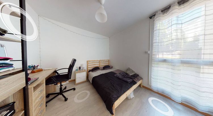 Chambre toute équipée avec lit double, bureau, fauteuil de bureau, table de chevet, lampe, penderie; double vitrage, volet électrique