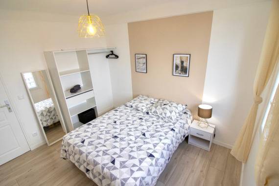 Chambre rénovée équipé d'un bureau, dressing et d'un lit