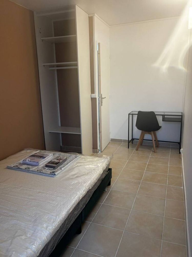 Chambre privative dotée d'un lit double avec matelas, d'un bureau, d'une chaise, d'une armoire et d'un réfrigérateur individuel.