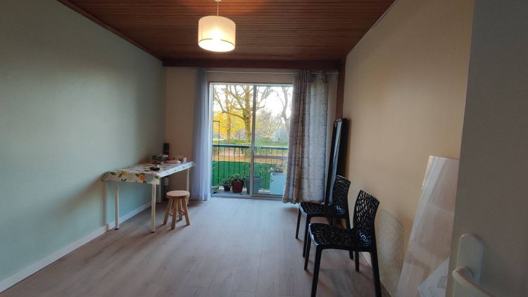 Chambre meublée avec balcon , vue sur parc arboré , calme et lumineuse. Décoré : miroir , tableaux , lampadaire , étagères