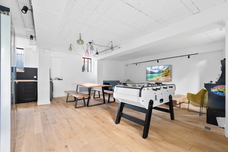 Au RDC : cuisine totalement équipée avec lave vaisselle salle à manger salon avec Grand écran tv, baby foot et Console vidéo Rangement et WC Parquet massif