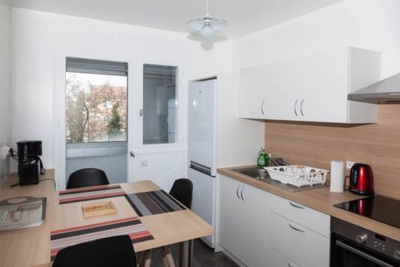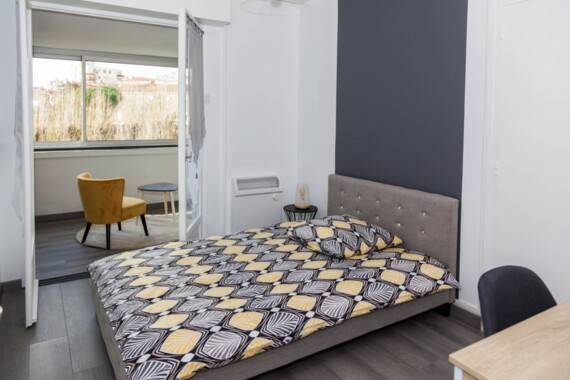 Chambre avec 1 lit (linge de maison inclu), un placard et un bureau, elle est attenante à une loggia qui est privatisée pour le locataire de cette chambre lui ajoutant de l'espace de vie. La loggia comporte un fauteuil et une petite table pour pouvois se poser.
