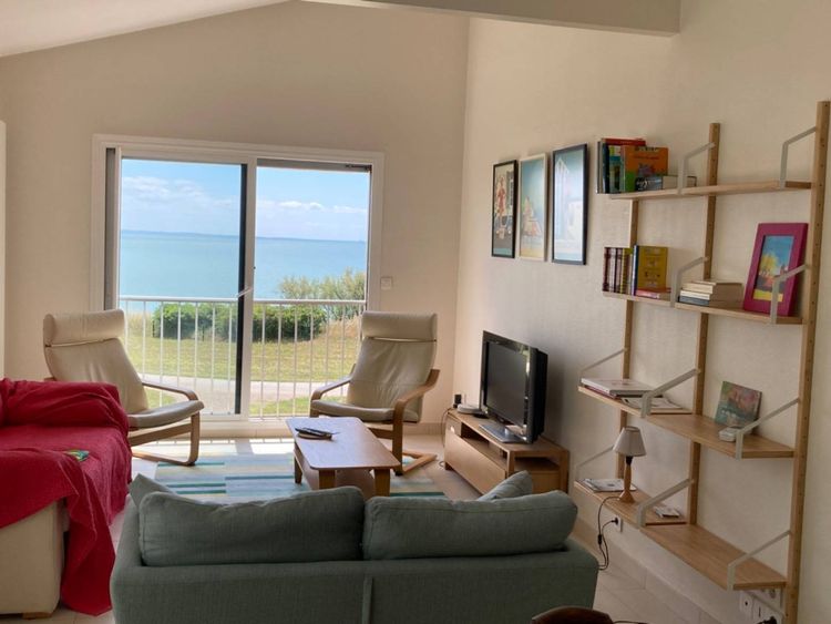 Chambre avec lit simple, bureau, armoire de rangement. Trés vaste pièce commune avec vue mer avec salon et séjour.