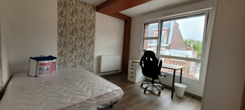 chambre avec lit 140*190, bureau, fauteuil de bureau, penderie.