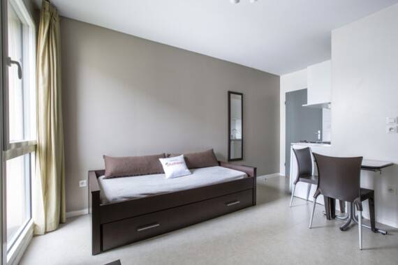 The student residence Neoresid Lille Lambret is located near the main roads and Eurasanté Park. Our residence is secure and is equipped with many services such as a gym, a launderette, a common room and private parking and secure (parking surcharge). Our studios have an area of 19 m². They are equipped with a kitchenette with microwave, fridge / freezer, hob and sink. The shower rooms are private. The main room consists of a double bed, a desk, shelves, chairs and a table. We offer long stays but also short stays (minimum 3 months).