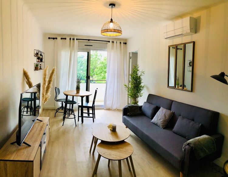 Lit coffre en 140, parure de draps et serviettes, un placard de rangement, bureau + chaise, salle de bain à partager pour les 2 chambres, 1 table et 2 chaises pour votre balcon