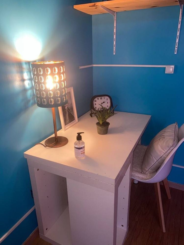 chambre meublée avec petit lit , bureau, coin placard pour rangement. Tablettes et 1 lampe de chevet, une chaises. Vous pouvez profiter de la grande salle qui fait office de salon, en dehors des heures de journée.
