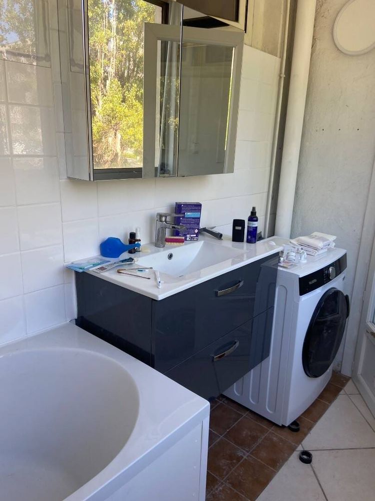 Chambre orientée ouest, meublée lit double + 2 tiroirs penderie bureau bloc tiroirs balcon climatisation.