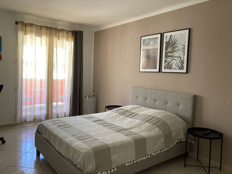 Chambre 1 de 15,40 m² disposant d'une terrasse avec aperçu mer, composée d'un lit double, un bureau avec chaise, un dressing, une commode, un miroir, une télévision 4K connectée. Couette et 2 oreillers fournis. Les meubles sont neufs. Prestations comprises : Électricité / Internet Fibre / ménage des parties communes une fois par semaine.