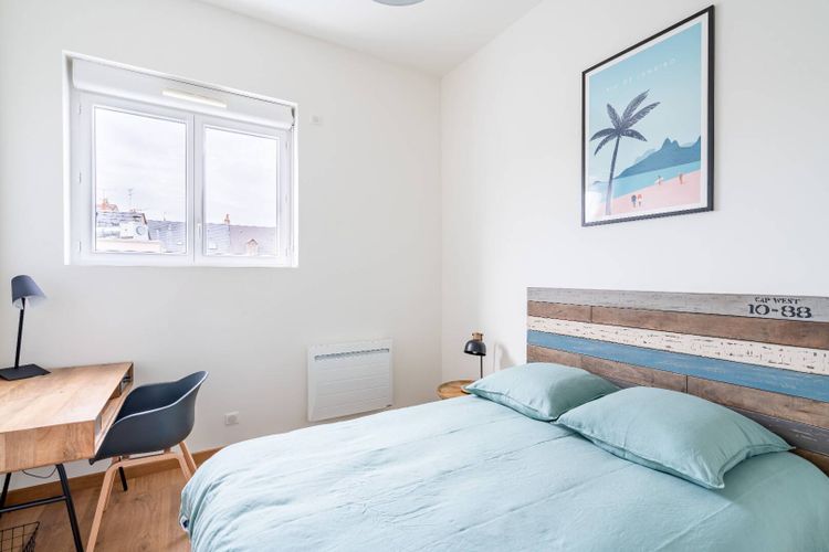 Chambre avec lit double, TV connectée, bureau, grand espace de rangement, très lumineuse