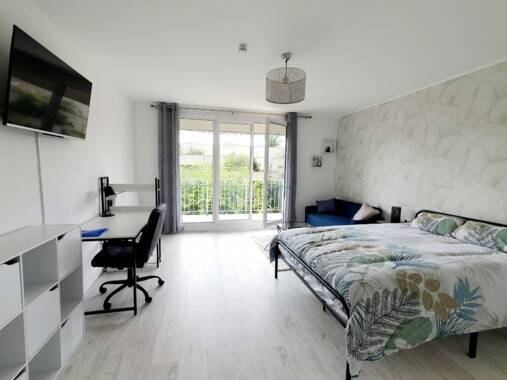 Grande chambre de 20 m² avec accès au balcon. Équipement de la chambre : un lit double 140×200 avec un matelas de qualité (linge de lit fourni), table de chevet avec lampe, dressing, panier à linge, bureau avec une chaise et une lampe, un canapé et table basse, une télévision. Chaque chambre dispose de son propre verrou.