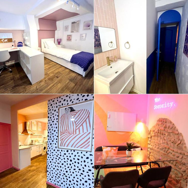 Chambre Pink. Chaque chambre est équipée : un lit 90x200cm, un dressing, une table de chevet, un bureau, des rangements, des tableaux, un système de séchage du linge, un miroir, une lampe de chevet, une lampe de bureau, une chaise de bureau, un Alexa Dot, un ventilateur, une penderie, des draps, couettes et oreillers.