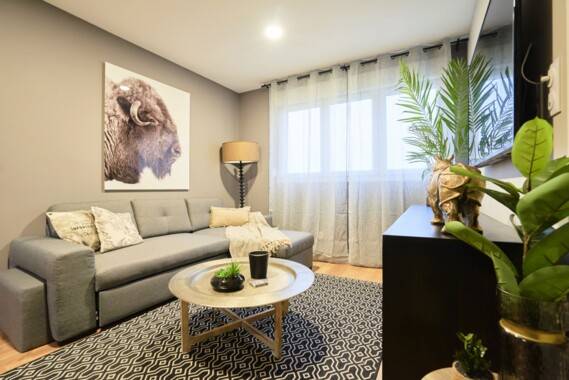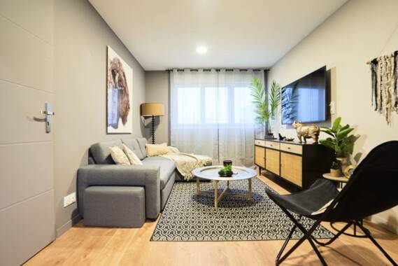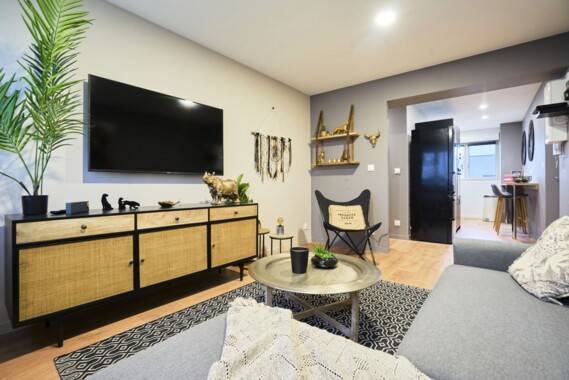 - Une pièce à vivre avec une décoration cosy avec TV écran plat.