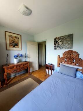 Grand chambre lumineuse, côte sud, plan de travai ,(bureau, bibliotheque) meubles en bois exotiques, lit double , table chevet, gran miroir, placard.