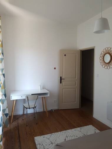 Parquet au sol, accès terrasse plein sud, chambre meublée, lit double 190x140, penderie, coffre, bureau, tapis, luminaires etc.... Salle d'eau partagée avec une seule personne