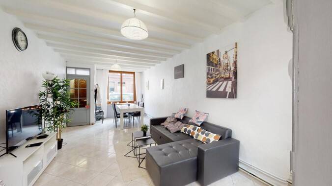 Venez découvrir au 130 Rue De Denain dans la commune de Roubaix (59100) cette colocation de 4 chambres de 105 m². 🛌 LA CHAMBRE La chambre 1 dispose d’un lit double, de placards de rangement, d’une table de chevet accompagnée d’une lampe de chevet et d’un bureau accompagné d’une chaise. 🏠 LES ESPACES COMMUNS Cette maison comporte trois niveaux, de deux salles de bain et quatre chambres. Au rez-de-chaussée se trouve la pièce de vie avec un espace salon et salle à manger (muni d’un canapé, d’une table basse, d’un meuble TV, d’une TV, d’une table, de chaises), une cuisine très bien équipée (Four, micro-ondes, plaques de cuisson, hotte, frigidaire, lave-vaisselle, etc.), et d’une salle de bain commune (équipée d’une douche, d’une machine à laver, et d’un double meuble vasque). Au 1ᵉʳ étage se trouve deux chambres et au 2ᵉ étage se trouve deux autres chambres, ainsi qu’une salle de bain accessible uniquement par ces chambres 3 et 4. Cette salle de bain est à l’usage exclusif des locataires des chambres 3, 4 et se munit d’un meuble vasque, d’un WC, d’un sèche-serviette, et d’une cabine de douche. Les chambres sont toutes équipées d’un lit double, d’un meuble dressing, d’une table de chevet accompagnée d’une lampe de chevet et d’un bureau accompagné d’une chaise. 🌳 LES EXTÉRIEURS Une cave est associée à cette maison. 🏙️ LE QUARTIER La localisation de ce bien est idéale, proche du centre-ville et du centre hospitalier et de la maternité de Roubaix. Vous serez situé à seulement 15 minutes à pied du centre-ville, et disposerez de nombreuses commodités à proximité, dont un magasin Lidl à 100 mètres. ⚡️ Inclus dans les charges : Entretien de la chaudière Internet Fibre Chauffage Eau chaude Gaz Electricité Taxe Ordures Ménagères Eau courante —————————————————————— Bail individuel à la chambre. Pas de caution solidaire. Chacun est libre de partir quand il veut sans se soucier des autres colocs, dès le moment où il respecte un mois de préavis. Eligible aux APL. REFERENCE DU BIEN : SP5682H