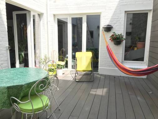 Une grande chambre au 2e étage, lumineuse avec ses grandes fenêtres de toit, traversante, vous aurez une vue sur le square en face. D'environ 30 m2, vous pourrez profiter d'un lit de 140cm de large, d'une table, d'une penderie et une commode, d'un espace salon privé. (2 oreillers, grande couette, linge de lit fourni, draps de bain fournis) Beaucoup de rangements avec un grenier privatif attenant. Salle de douche privative (120x90cm)avec wc, meuble large attenante. Escalier privatif. 2e étage, donnant sur patio