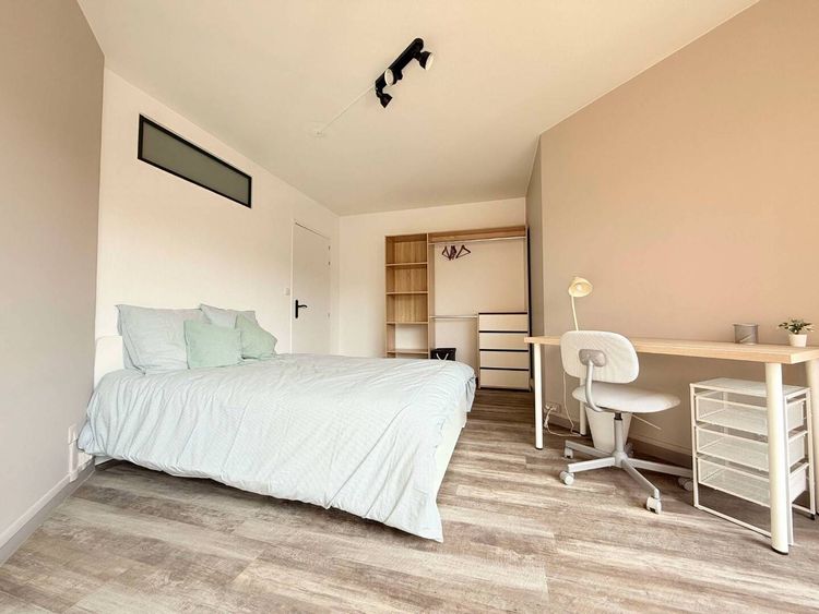 Les chambres comprennent un lit de deux places 140*200 mm et des draps neufs de très bonne qualité, un dressing agréable, une table de nuit, un bureau et sa chaise ergonomique et une lampe de bureau. Les chambres ont peu voire pas de vis-à-vis.