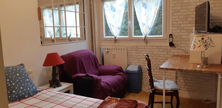Vue sur espace vert avec un lit en 90 - une table de chevet - 2 lampes - un bureau - un fauteuil confortable- 2 perites petites armoires - TV avec wifi et plusieurs prises. Tapis.