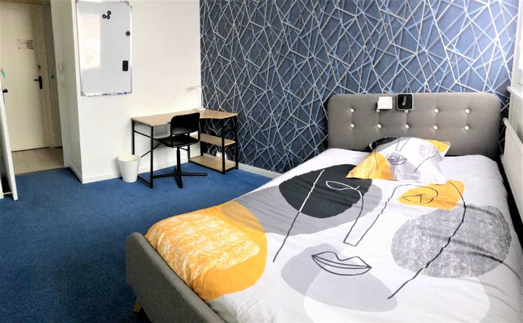 chambre Lumineuse, Grand lit, Bureau avec sa chaise et une lampe, nombreux rangements + Penderie, Tableau blanc mural, corbeille linge & papier, fermeture à clé.