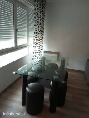 A l'entrée vous trouvez un couloir qui dessert la salle de bains avec baignoire et un WC ainsi qu'un lave-linge . A droite de l'entrée, vous trouvez un grand espace de vie avec un salon - salle à manger pouvant recevoir 4-6 personnes . Vous trouvez un espace de salon avec un canapé lit 2 personnes de bonne qualité, table-apéritif et un meuble Tv équipé d'un téléviseur Samsung HD
