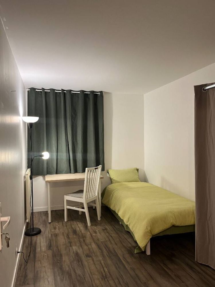 Cette chambre spacieuse est équipée d’un lit, d’un bureau, d’une armoire, et dispose en plus d’un frigo personnel, d’un canapé et d’une télévision. La cuisine, la salle de bains et les toilettes sont partagées avec les autres colocataires. Cuisine entièrement équipée.