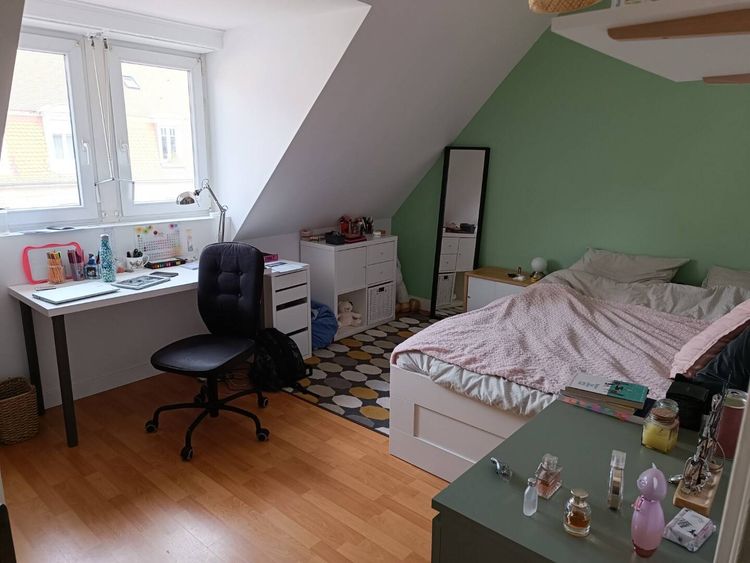 Chambre de 12m² Carrez, 15 au sol; avec une grande fenêtre et le chambre de la soupente. Meublé d'un lit double, une commode, un bureau, une chaise de bureau, un espace dressing pour le rangement des vêtements.