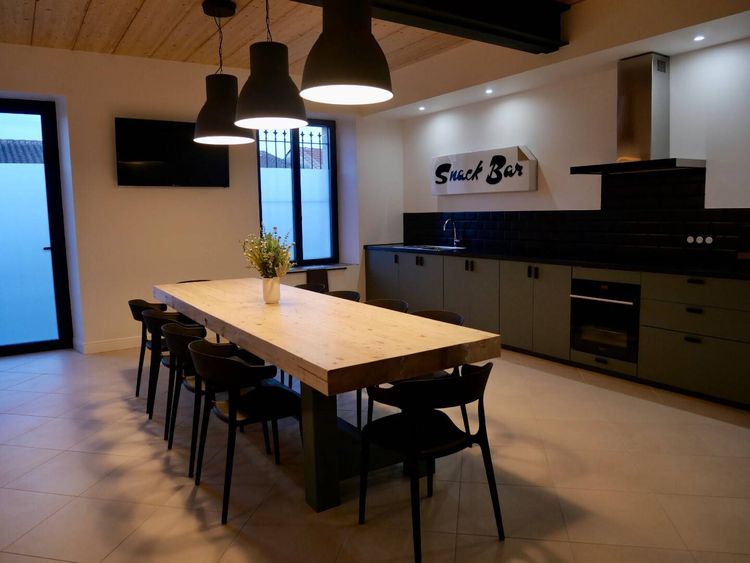 La cuisine neuve est très bien équipée, la buanderie où se trouve la machine à laver et le sèche linge, le garage à vélo et le jardin sont autant d'espaces à partager pratiques et conviviaux.