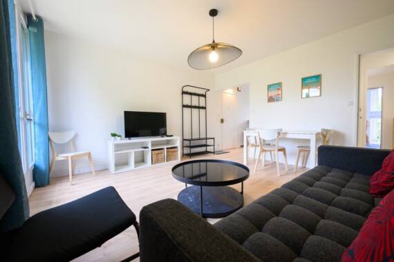 L'appartement comprend un séjour avec salon, TV, internet, une cuisine toute équipée : frigo, four, lave-vaisselle, four micro-onde, vaisselle, casseroles, table et chaises...)