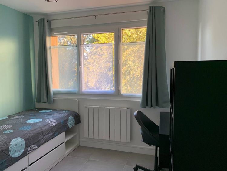 Chambre lumineuse, fonctionnelle avec de nombreux placards. Elle comprend: un lit (90x200), un bureau, une chaise, un meuble de rangement, une armoire intégrée (étagères et penderie) et un miroir. Linge de lit fourni (couette, oreiller, draps).