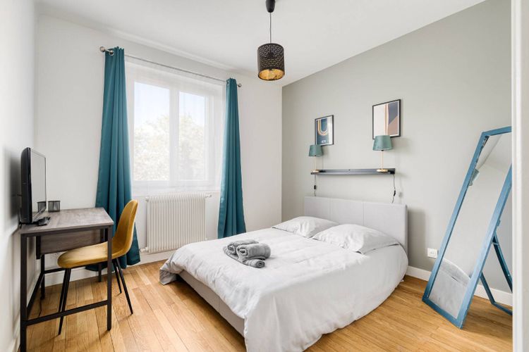 Lit double + bureau+ écran. Placard intégré. Donne sur la cour de l'immeuble (= calme) Orienté est.
