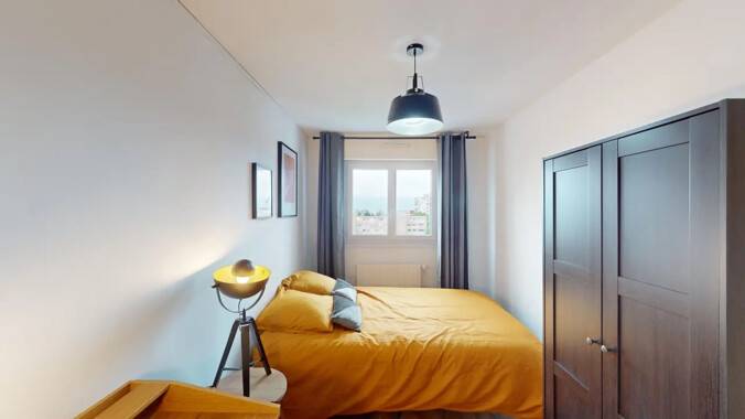Elle dispose d'un lit double, d'un bureau, d'une chaise, d'une table de nuit avec une lampe ainsi qu'un placard de rangement.