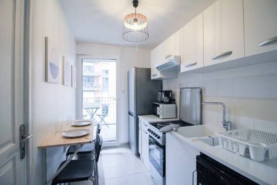 Chambre de 11m², entièrement meublée. Elle dispose d’un lit double (140x190) accompagné d'une table de chevet avec lampe. Un espace de travail est disponible, composé d'un bureau avec chaise et lampe. La chambre propose également plusieurs rangements : un placard intégré avec penderie et une étagère. Les atouts de cette chambre sont son coin salon composé d'une table basse et d'un fauteuil ainsi que son accès au balcon. Situé aux portes de Paris, cet appartement de 90m² bénéficie d’un emplacement idéal, à deux pas du Parc Roger Salengro et de la station de métro : Saint Ouen et à proximité de toutes les commodités. L’appartement se trouve au 5ème étage d’un immeuble sécurisé avec digicodes et disposant d’un ascenseur et d’un garage à vélo. L'appartement est composé de 4 chambres, une cuisine, une salle de bain, une salle d’eau et un WC séparé. Toutes les pièces sont entièrement équipées et meublées. Le tout agencé et décoré avec soin. La cuisine est équipée d’électroménager neuf et de qualité. Elle contient, un réfrigérateur, des plaques de cuisson, une hotte, un four, un micro-onde, une machine à café, une bouilloire, un grille-pain et un lave-vaisselle; Un espace avec une table et des chaises est disponible ainsi que divers rangements et toute la vaisselle nécessaire. La salle de bain dispose d’une baignoire, d’un lavabo et de rangements. La salle d’eau dispose d’une douche, d’un lave-linge, d’un sèche-linge et d’un lavabo. Tous les équipements nécessaires pour le ménage (balai, serpillère, aspirateur) sont mis à votre disposition dans le placard à l’entrée de l’appartement. Le loyer comprend une provision sur charges : électricité, eau, chauffage, internet et l'assurance habitation. Le logement est éligible aux APL (bail individuel).