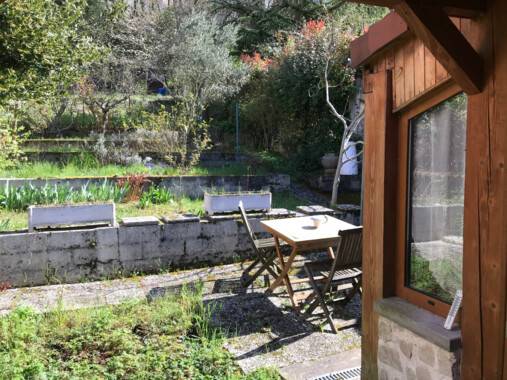 Ils s'agit dune petite chambre avec bureau et canapé lit. Possibilité de mettre un lit de 120cmx200cm. Très belle vue sur jardin paysager. Cette chambre donne sur une terrasse avec auvent équipée dune table et 4 chaises en bois pouvant servir de salon extérieur dans les beaux jours.