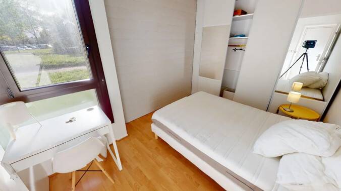 La chambre est louée avec un bureau, un lit, une penderie et un placard.