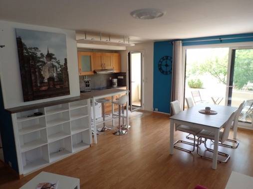 Profitez d'une grande pièce à vivre avec séjour de 33m² et cuisine ouverte donnant accès à un balcon loggia équipé d'une table de jardin et jardinière.