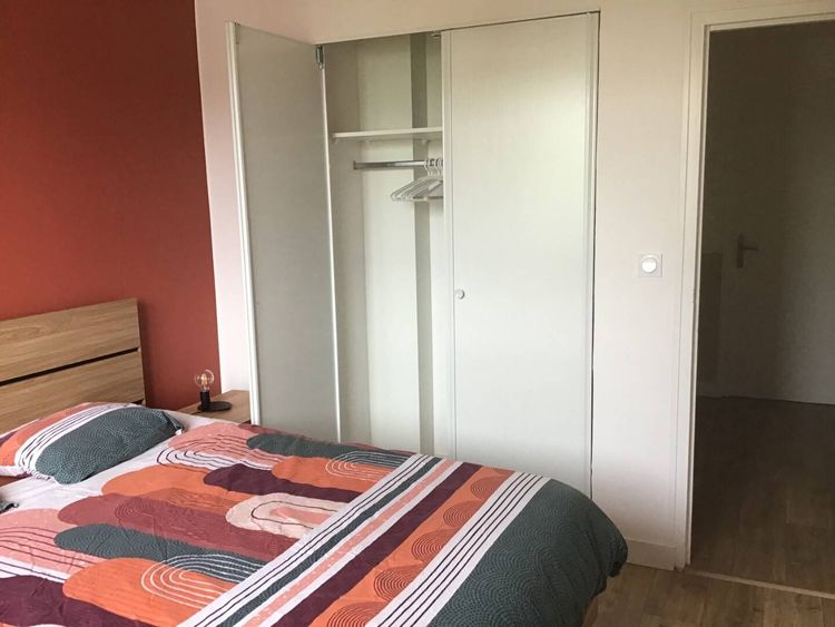 Chambre sur rue calme, avec placard et commode, lit et table de chevet, table et chaise de bureau. Le linge de lit est fourni.