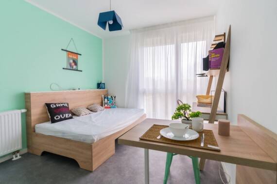 Studio flat, comprising a living room with a fitted kitchen (fridge, ceramic hob, microwave, extractor fan, storage space, crockery kit, cleaning kit), a desk with a chair, a dining table with seats, a 120 x 200 cm bed (with pillow and duvet), mirror, built-in bedside cabinet, cupboard, and a shower room comprising a shower, washbasin with mirrored vanity unit and led strip, heated towel rail and toilet.