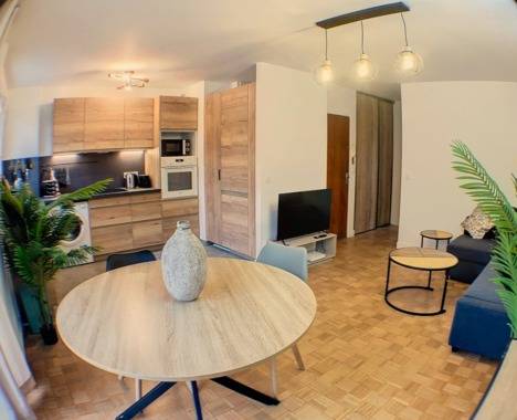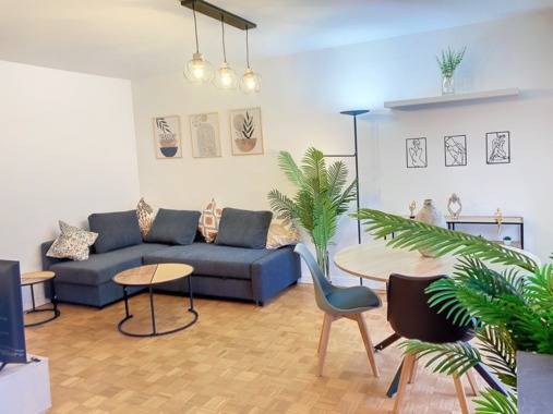 Recently refurbished, very quiet, in a residence with controlled access, 2 bedrooms 1with beds 40 cm width and a desk, living room (with convertible sofa), fully equipped kitchen : Micro-wave Owen, Owen, Fridge, Freezer, Washing machine, Tea Kettle, Toaster, Coffee machine, flatware/dishes/glasses, washing machine/dryer, smart TV, iron and ironing board, Hair dryer.