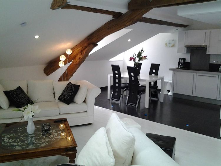 Jolie chambre poutres apparentes avec 1 lit en 160. 1 commode 1 chiffonnier 2 chevets 1 fenêtre Dans le salon très grand placard avec penderie et étagères