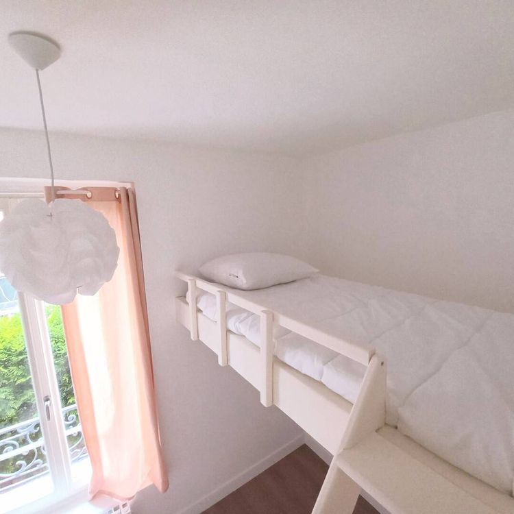 La chambre blanche, équipée d'un lit mezzanine, bureau, chaise de bureau, armoire. Porte équipée d'un verrou. Les fenêtres sont hautes et donnent sur la grille de la copropriété.