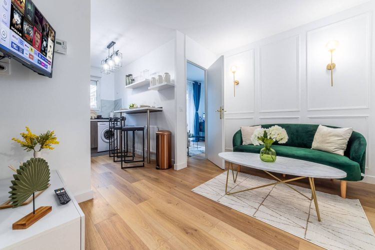 Chambre meublée avec un lit deux places, deux chevets de lits, une lampe de chevet, placards de rangement privatif, luminaire, rideaux et tableaux décoratifs, miroir. Un petit espace salon privatif intérieur, avec canapé, table basse, meuble TV et TV avec accès sur grand balcon (vue sur jardin). Possibilité de mettre un bureau et une chaise. Salle de bain et WC partagés avec les 2 autres chambres.