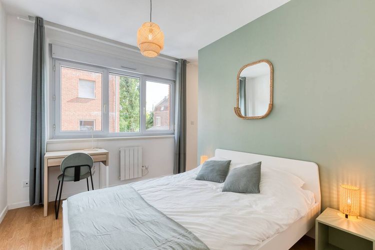 Chambre meublée - Lit - Armoire de rangement - Table de bureau - Chaise - Abat jour