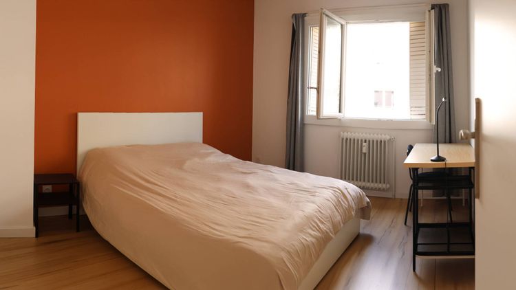 Petite chambre avec placard mural, petit bureau, lit double avec matelas neuf et linge de lit. Avec balcon privé. Small bedroom with wall cupboard, small desk, double bed with new mattress and bed linen. With private balcony.