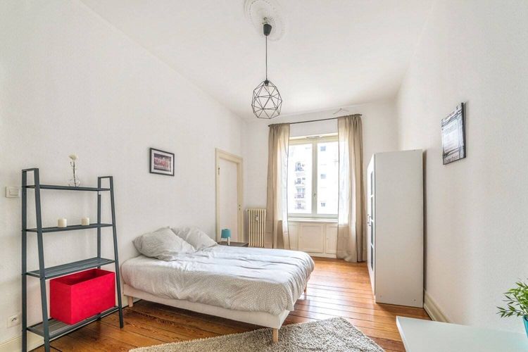 Très grande chambre lumineuse de 20m² grâce à son charmand bow-window. Elle dispose d’un lit double (140x190) accompagné d'une table de chevet avec lampe. Un espace de travail est disponible, composé d'un bureau avec chaise et lampe. La chambre propose également plusieurs rangements : une armoire avec penderie et une étagère. Situé dans le quartier Kable, cet appartement de 133m² bénéficie d’un emplacement idéal, à deux pas du Parc du Contades et de la station République et à proximité de toutes les commodités. L’appartement se trouve au 1er étage d’un immeuble sécurisé disposant d’un local vélo. L'appartement est composé de 5 chambres, une cuisine, une salle de bain et un WC séparé. Toutes les pièces sont entièrement équipées et meublées. Le tout agencé et décoré avec soin. La cuisine est équipée d’électroménagers neufs et de qualité. Elle contient, un réfrigérateur, des plaques de cuisson, une hotte, un four, un micro-onde, une machine à café, une bouilloire, un grille-pain et un lave-vaisselle,. un espace avec table et chaises est disponible ainsi que divers rangements. La salle de bain dispose d’une baignoire, d’un lavabo, d’un lave-linge et de rangements. Tous les équipements nécessaires pour le ménage (balai, serpillère, aspirateur) sont mis à votre disposition dans l’appartement. Le loyer comprend une provision sur charges : électricité, eau, chauffage, internet et l'assurance habitation. Le logement est éligible aux APL (bail individuel).